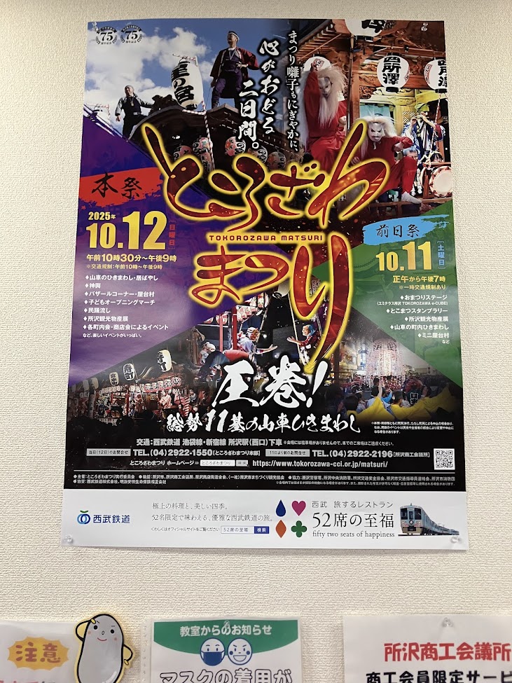 スタッフとしては所沢教室に10年前から所属している者はいないため、私たちパソコン教室が何か出し物をするということは無いものの、授業がどうなるかはドキドキだったりもしています。ひょっとしたら授業中に笛や太鼓の音が聞こえてくる中で授業が行われるかもしれませんね。